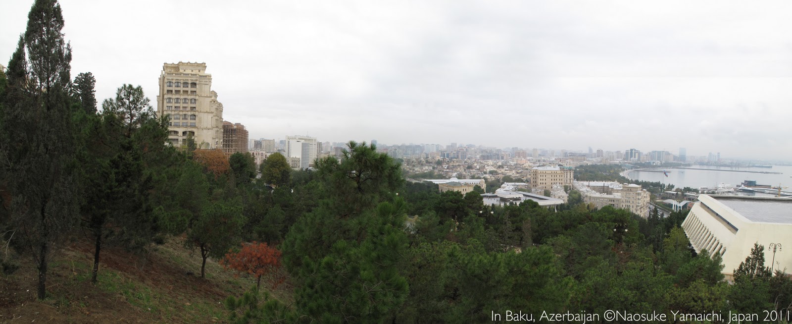 きれいな公園がその脇に続いていた。その公園を掃除している数人の男性。通り過ぎ、またその先の公園でも4人の男性が雨合羽を着て、掃除していた。話しかける。でも、全く通じず、英語もロシア語も通じなくて、相手も構わずアゼルバイジャン語で話してきて余計にわからなくて、だからこっちも日本語で返す。わけのわからない30分。でも最後には写真を撮らせてくれた。というか、「上司に怒られるから、写真撮ってもらうなんてできない」とかなんとか言ってたくせに、30分近く喋り、身振り手振り、タバコを吸い出したり、ケータイで僕を写メしたり散々した挙げ句、結局写真を撮らせてくれたから、大したことは無いんだろう。と信じたい。12時過ぎ。